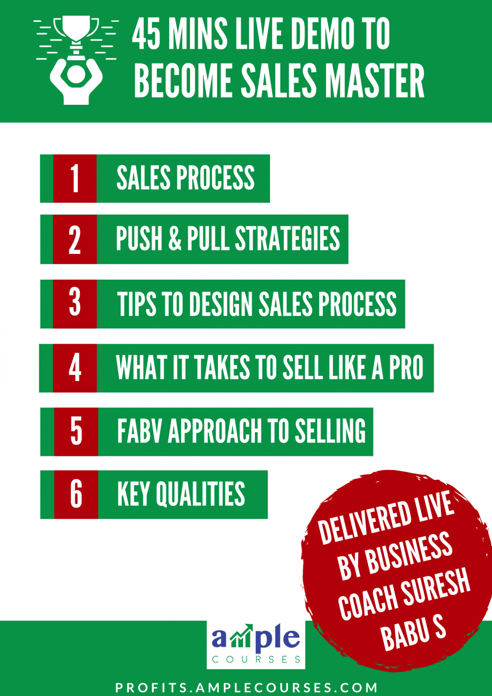 In this 45 mins LIVE Demo session, learn about - Sales Process - Push & Pull Strategies - Tips to design Sales Process - What it takes to sell like a pro - FABV Approach to Selling - Key Qualities