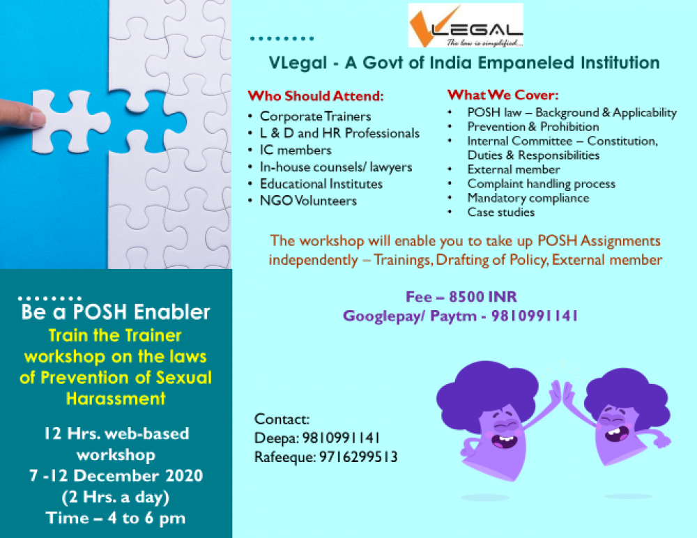 12 hours of learning - Train the Trainer workshop (web based) on law of Prevention of Sexual harassment at workplace