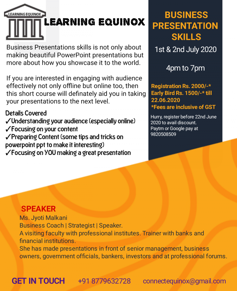 #learningequinox Are you an entrepreneur, coach, trainer, or anyone giving presentations on a regular basis Are you interested in learning how to engage with your audience? This one is for you. Sharpen your presentation skills and make the dialogue look professional. Join us on the 1st & 2nd July 2020 between 4pm to 7pm for an interactive session on business presentation skills. To register for the program click here https://surveyheart.com/form/5eec33fc93812e6d2efb678b If you want to have a small glimpse of what presentation skills are all about you can watch https://youtu.be/8oZvVWg43jY We are having very limited seats to encourage interactive participation. #presentation #businesspresentation #onlinesession