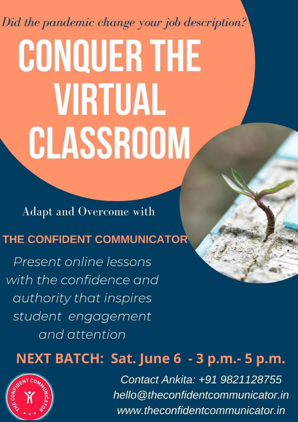 The Confident Communicator is conducting 2 hour sessions to empower professionals build their image online. The world has changed, and how they practice has to adapt to the changing requirements during lockdown and even after - as Covid19 looks like it's going to hang around for a while... Here are the Learning Outcomes for our current Teacher Training Session (Conquer the Virtual Classroom) :- Learning Outcomes Building an Online Persona – portray confidence, credibility and authority with your students Advantages of Online Learning Presenting Effectively Online Student Engagement and Attention Success Mantras for Online Teachers – Best Practices Call Our Curriculum Head Ankita: 9821128755 to register