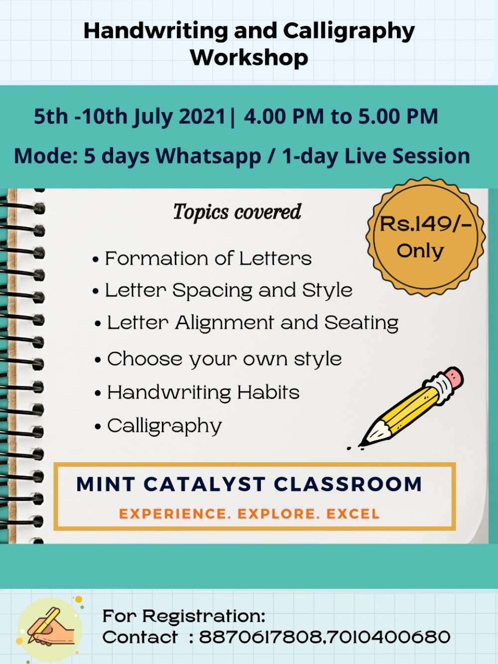 6 Days Workshop on Handwriting & Calligraphy with 5 days of WhatsApp sessions and 1 day of Live Online session.