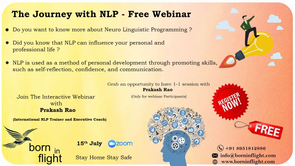 Hello, Do you want to know more Neuro Linguistic Programming? Did you know NLP can influence your Personal & Processional Life? Here is an opportunity to know about NLP!!! Join for an Interactive Free Webinar "The Journey with NLP" with Prakash Rao and grab an opportunity to have one on one session with Prakash Rao Date: 15th July 2020 Time: 5.00 pm to 6.00 pm Place: Zoom Platform