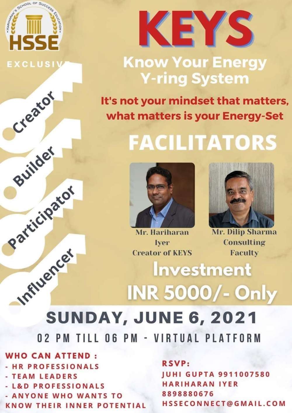 TESTIMONIAL FOR KEYS - YOU TOO CAN GET YOUR INDIVIDUAL ENERGY-SETS REPORT We are delighted to receive this testimonial for our KEYS program from Ajay Sachdev, GM - Learning and OD, Eureka Forbes Ltd: "Firstly, a big congratulations for such a path breaking tool called “Keys”. True to its word, it indeed unlocked critical blind spots for me, not only did it make me appreciate my “Active energies” but more importantly it gave me insights and reflect on how can I embrace my “latent energies”. Keys is indeed a powerful self-introspection tool. I not only gained while attempting the assessment but even more through the interpretation of the report (findings). The interpretation of my “creative” dimension according to the “Keys” has never been the same. I could clearly see my biggest hidden block. All I can say Friends, Keys can surely unlock the doors, but journey must be made by oneself. Thank you HSSE for rocking my boat and giving me a huge wake-up call. I must confess, this was much needed disruption for my progress as a “being”.