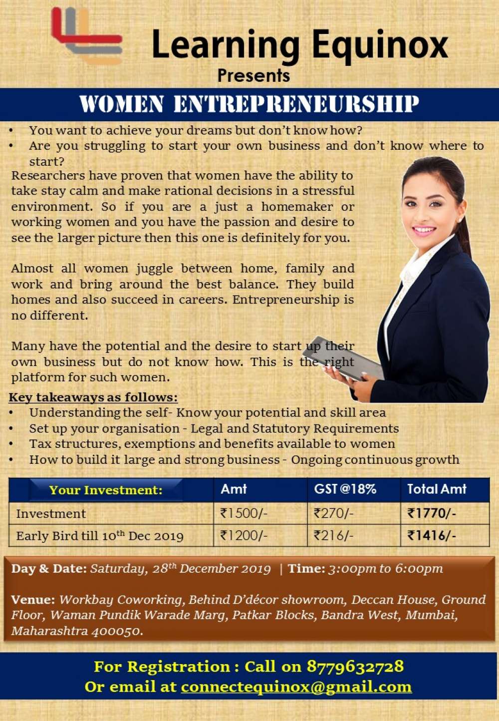You want to achieve your dreams but don’t know how? Are you struggling to start your own business and don’t know where to start? Researchers have proven that women have the ability to take stay calm and make rational decisions in a stressful environment. So if you are a just a homemaker or working women and you have the passion and desire to see the larger picture then this one is definitely for you. Almost all women juggle between home, family and work and bring around the best balance. They build homes and also succeed in careers. Entrepreneurship is no different. Many have the potential and the desire to start up their own business but do not know how. This is the right platform for such women. Key takeaways as follows: Understanding the self- Know your potential and skill area Set up your organisation - Legal and Statutory Requirements Tax structures, exemptions and benefits available to women How to build it large and strong business - Ongoing continuous growth